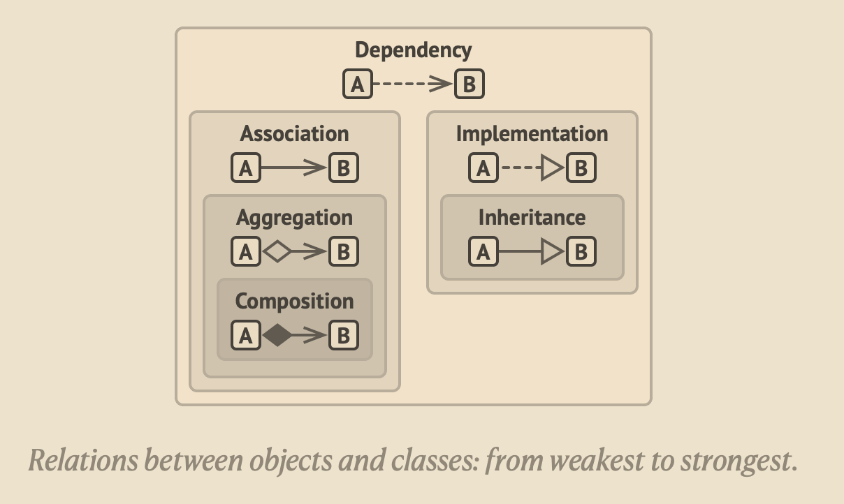 Dependency → Association → Aggregation/Implementation → Composition → Inheritance